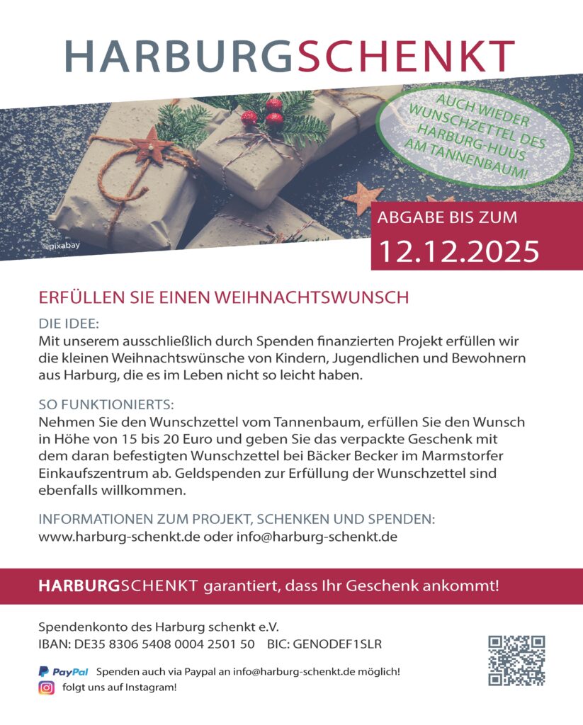 Wir von Harburg schenkt e.V. organisieren seit 2019 unsere sogenannte „Weihnachtsaktion“. Zu Weihnachten schreiben Kinder und Jugendliche aus Harburger Einrichtungen der Kinder- und Jugendhilfe ihren persönlichen Wunsch auf eine Weihnachtskarte. Diese Wunschkarten werden am Weihnachtsbaum im Marmstorfer Einkaufszentrum vor dem Geschäft Bäcker Becker aufgehängt.